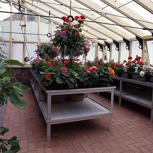 Aluminium Plate – supported at 2ft (60cm) intervals by fixed front to back aluminium bracing plus removable centre cross bracing. Easily removed for cleaning. It won’t rust or rot so capillary matting can be used to simplify watering.