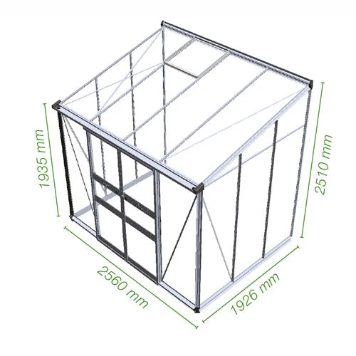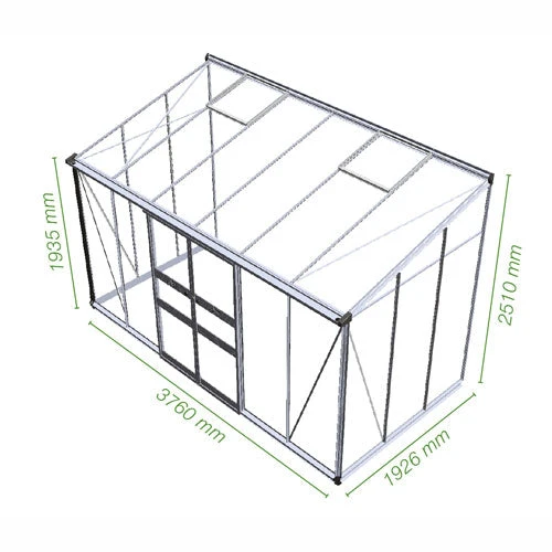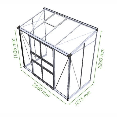 Door – access is via the 4′ wide double door, which comes complete with a key operated lock and is suspended on precision rollers which allow fingertip operation. The door is situated on the front of the lean-to greenhouse.