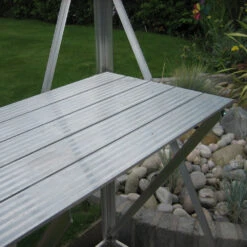 Diamond Shelving – made from extruded aluminium you will receive sufficient to fit down one side of the greenhouse. It will come with the same finish as the greenhouse. It is two slats wide, 7″ / 19cm wide, 8″ / 22cm from the glass.