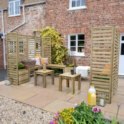 Set includes – 12 upright trellis panels, 4 benches, 4 square seat/tables and 3 square planters. Â