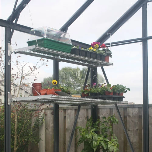 Both staging & shelving have a surface of 12 gauge / 1in square galvanised steel mesh, allowing excellent air circulation around the plants, so heat can rise & any surplus water can drain away quickly.
