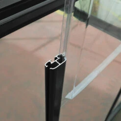 Crystal-clear Single Wall Polycarbonate Wall Glazing – 0.7mm thick this provides over 90% light transmission. It is UV protected so will not discolour, fracture or shatter over time. It is held securely in place in the aluminium frame due to a sliding assembly system, so the complete edge of the glazing is encased by the frame rather than being held in place with clips.