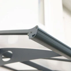Sturdy Frame – manufactured from rust-resistant, aluminium and with durable, laser cut, galvanised steel support arms with a dark grey finish (RAL7016). A front aluminium gutter directs rainwater sideways.Â