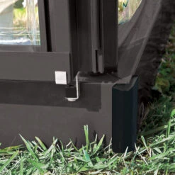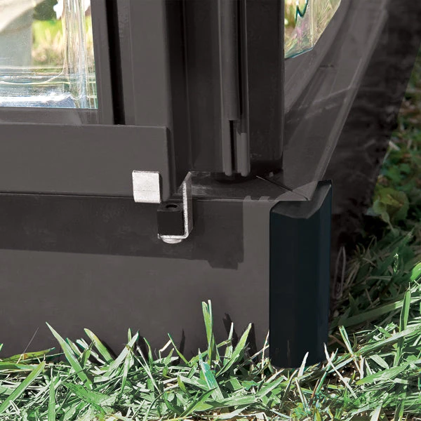 Galvanised Steel Base With Matching Dark-Grey Finish – this factory-made base will add structural stability to the greenhouse. This base can be anchored to a solid surface (such as concrete) using the pre-drilled holes in the base or it can be fitted to bare earth (fixings not included).