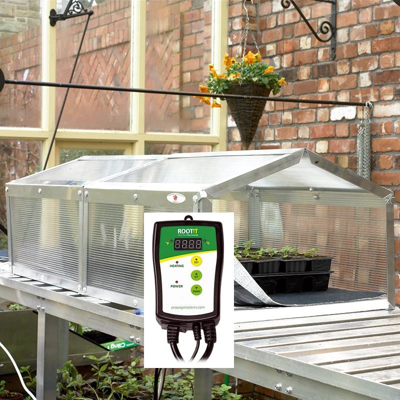 For accurate temperature control the blanket has a Root!t Thermostat connected to it. With a temperature range of 10-30ºC (50-86 ºF ) you can set the thermostat to the temperature you wish to achieve and place the temperature sensor (on the end of a 75 inch flexible lead) within the compost where your plants are growing for accurate control.
